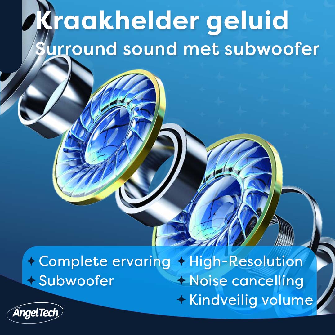 De AngelTech Kinderkoptelefoon geeft een professioneel hoog kwaliteit geluid en is onder andere uitgerust met een Kleine subwoofer waardoor ook basgeluid erg goed doorkomt. Gebruik de noisecancelling functie voor nog meer luisterplezier!